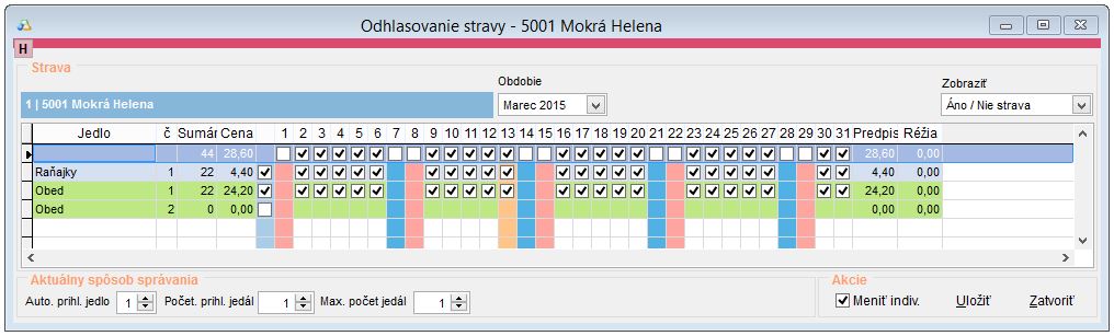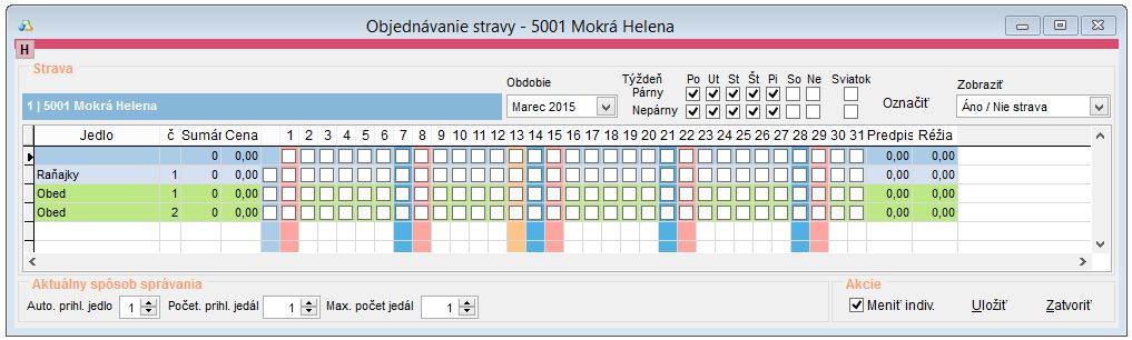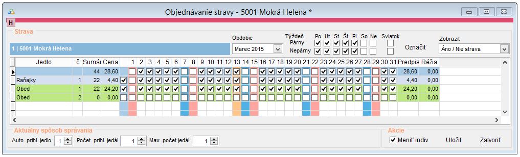 - Áno / Nie strava - zobrazenie iba zaškrtávacich políčok, či je na daný deň vytvorená objednávka.