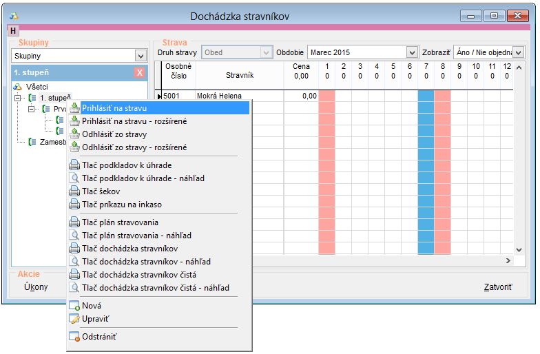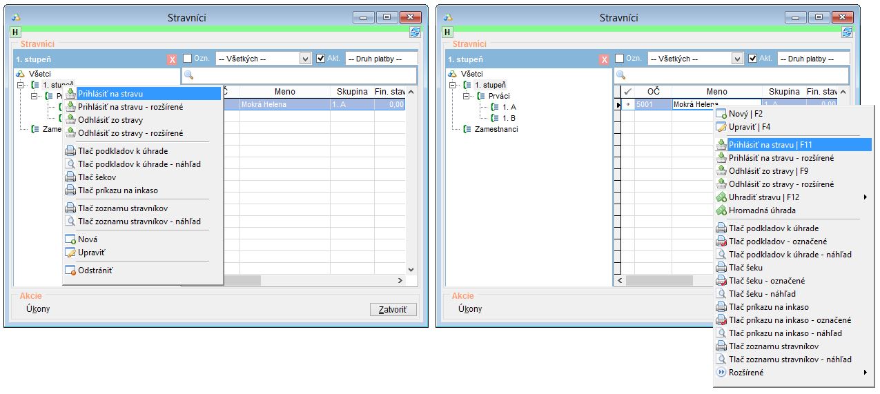 Prihlasovanie/odhlasovanie stravy je možné uskutočniť v každom okne, kde vidíte stravníka, alebo skupinu stravníkov. Kliknutím pravým tlačidlom na daného stravníka (alebo skupinu stravníkov) a následne kliknutím ľavým tlačidlom na možnosť Prihlásiť na stravu alebo Odhlásiť zo stravy.