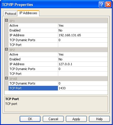 - V záložke IP Adresses nastavte v spodnej časti "IPAll" port, na ktorom bude aplikácia bežať. TCP Port -> 1433, zmenu potvrdíte kliknutím na tlačidlo OK.