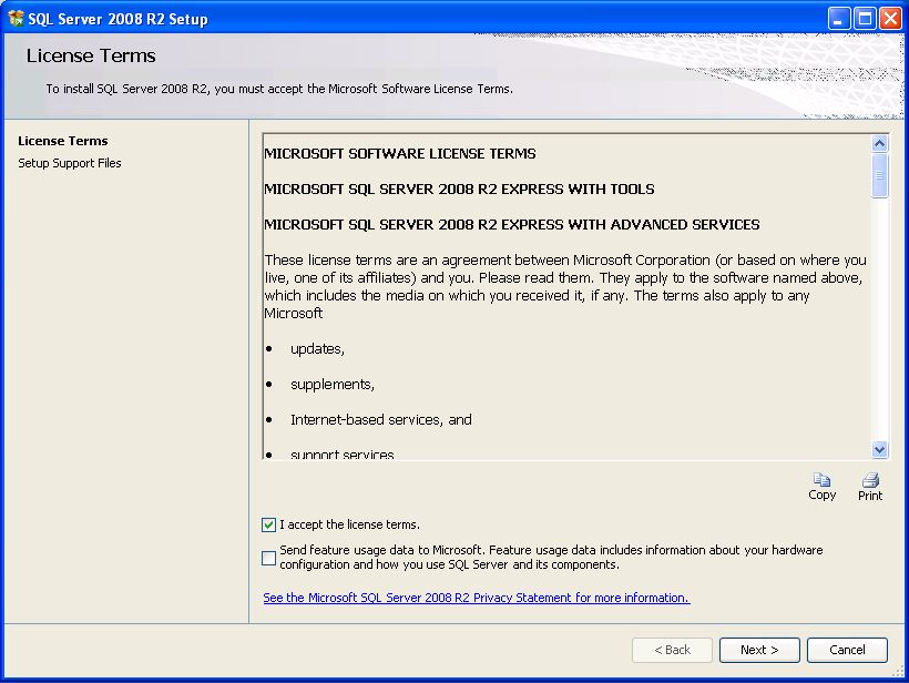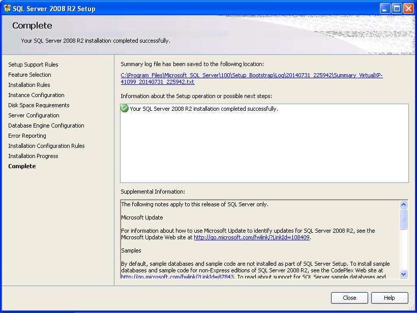 - Spustí sa proces inštalácie, o jeho úspešnom nainštalovaní budete informovaný hlásením "Your SQL Server 2008 R2 installation completed succesfully."