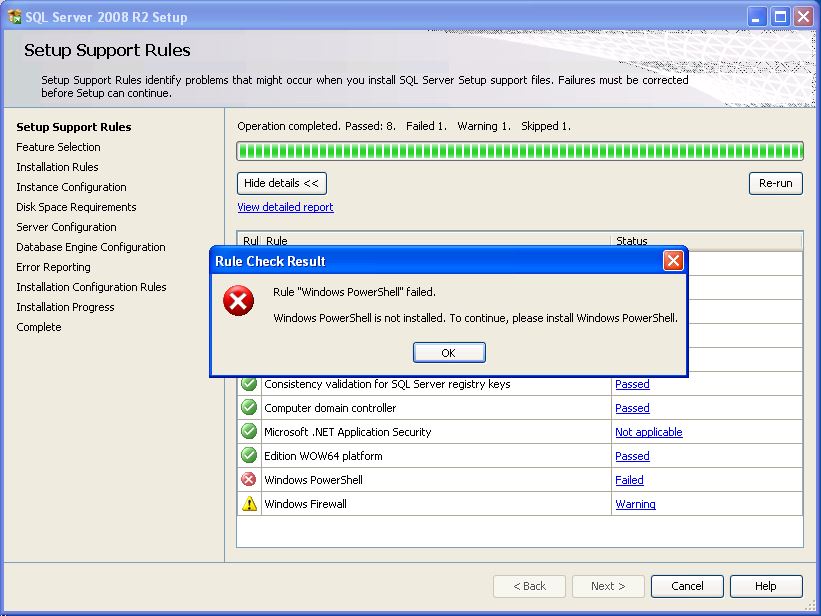 - Ak žiadne požadované pravidlo nie je v stave Failed, je možné pokračovať v inštalácii kliknutím na tlačidlo Next >.