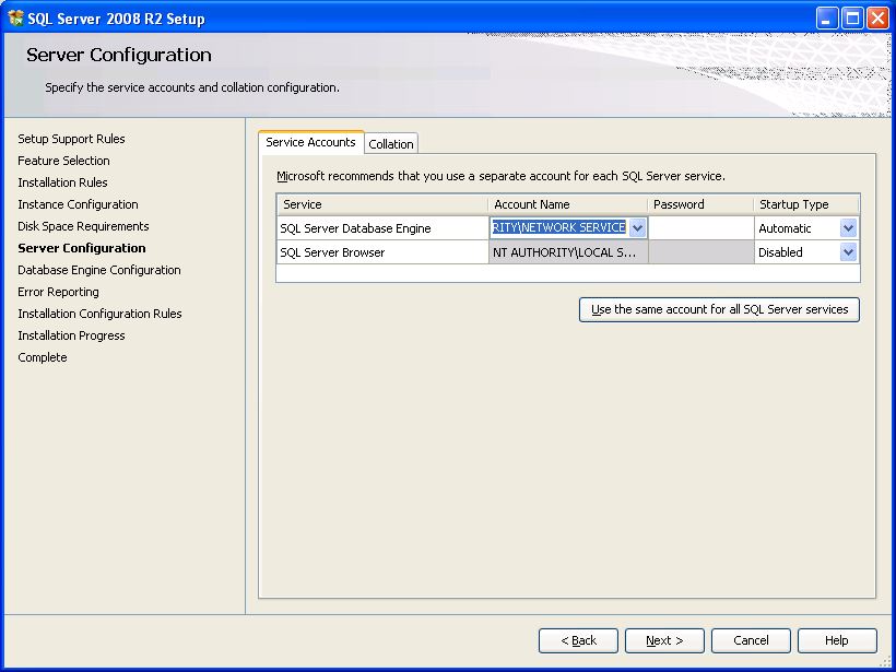 - Skontrolujte nastavenie účtu pre SQL službu. "SQL Server Database Engine -> NT Authority\NETWORK SERVICE" a typ spúšťania (Startup Type) -> Automatic, pokračujte kliknutím na Next >.