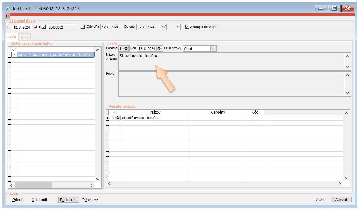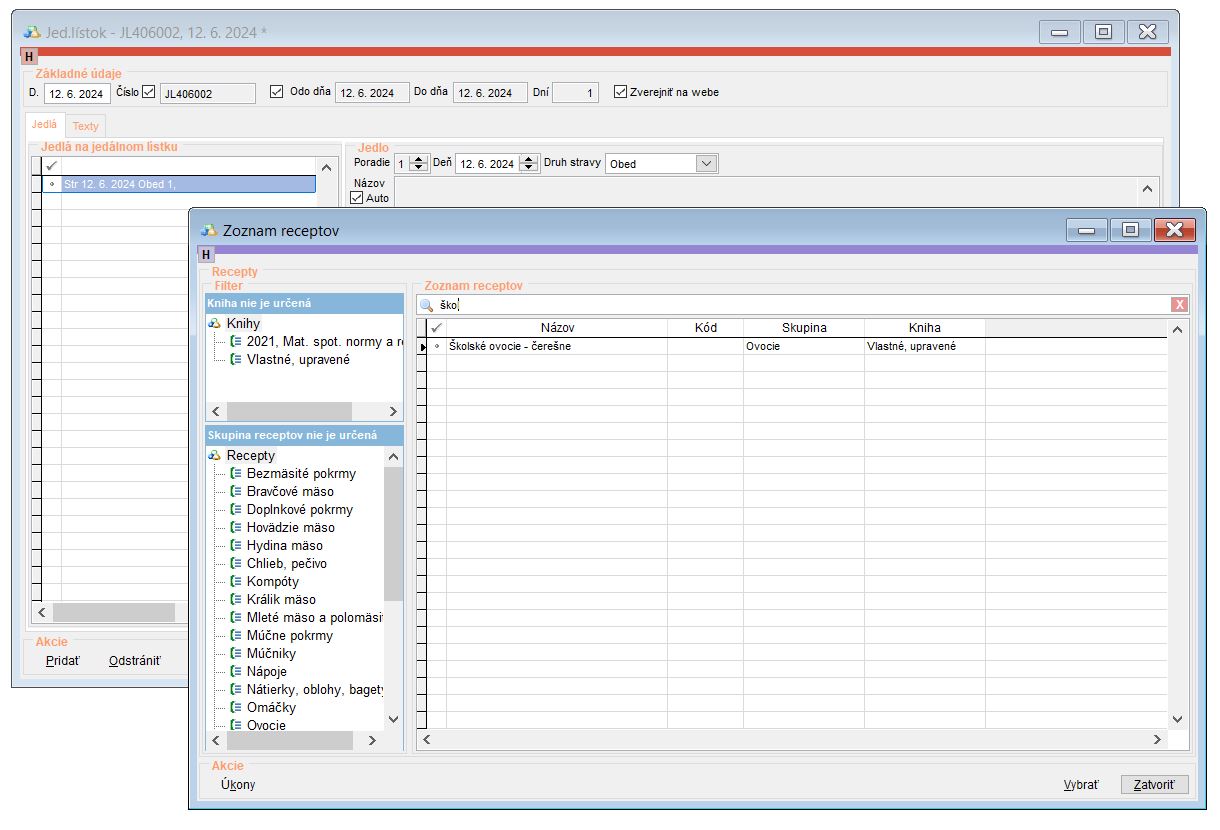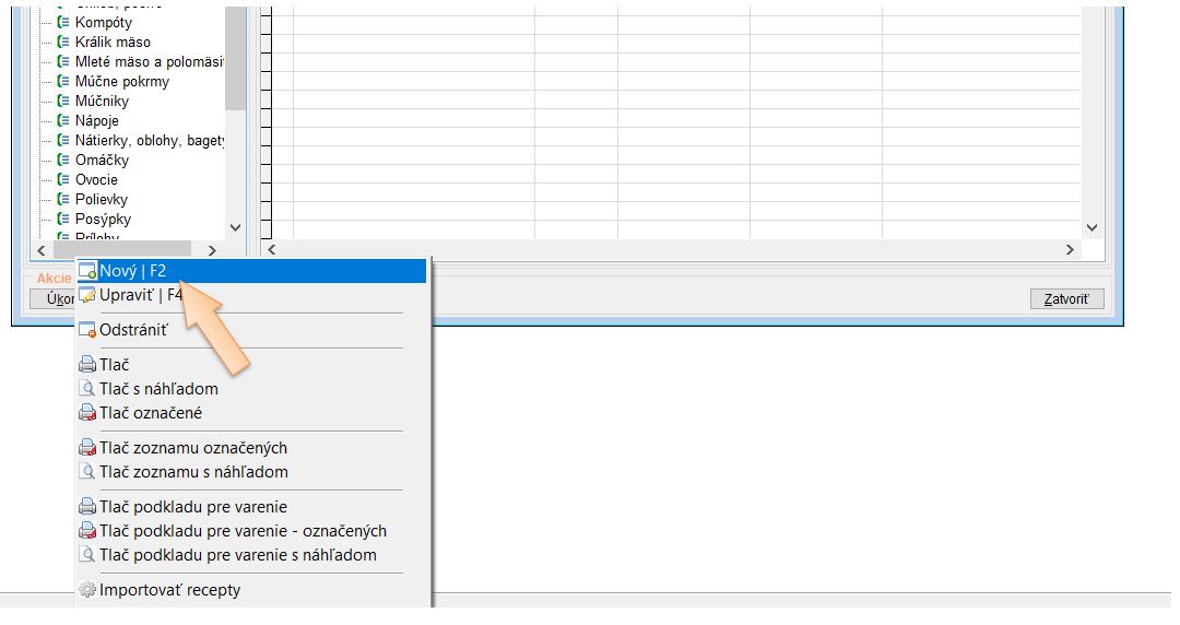 Pridanie receptúry na jedálny lístok