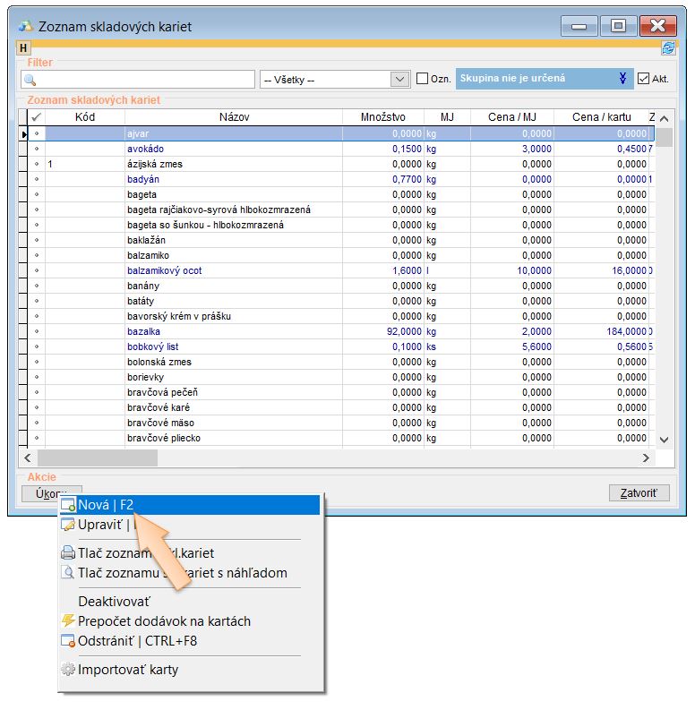 2. Kliknutím na Úkony a Nová vytvoríme novú kartu.