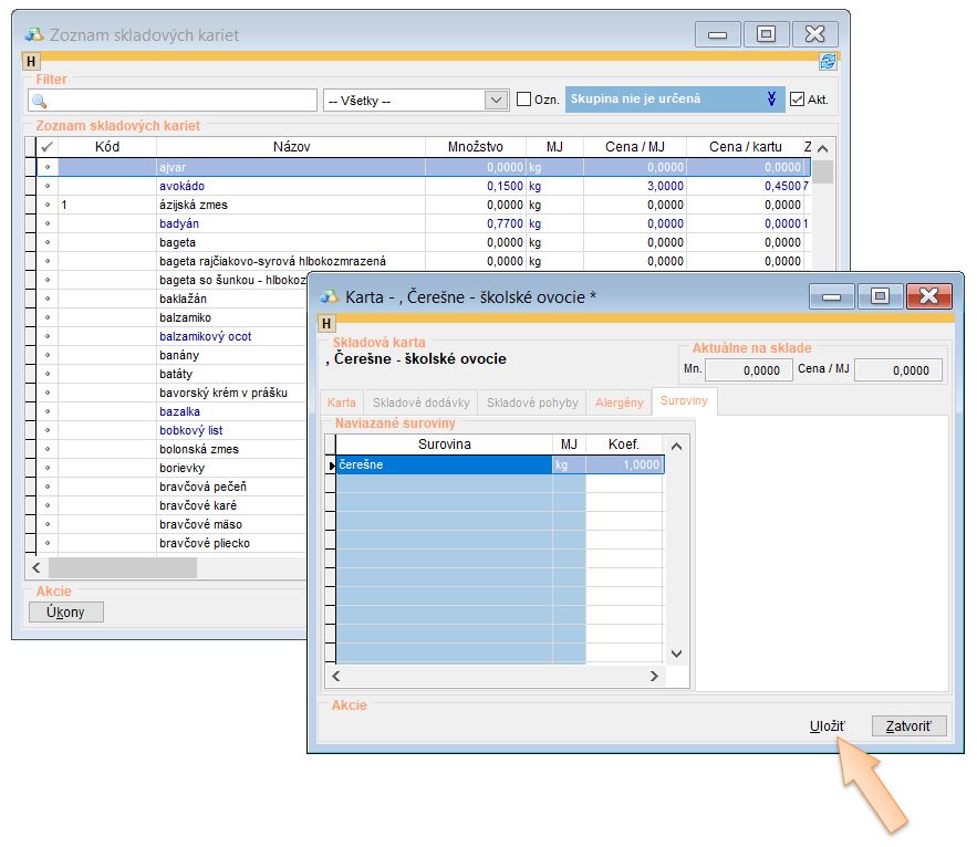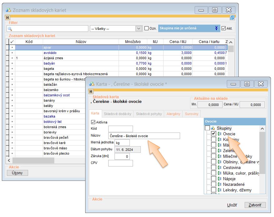 Takto vytvorenú skladovú kartu viete evidovať aj na sklade. Stačí vybrať dodávateľa, vyhľadať príslušnú kartu školského ovocia, zadať množstvo a nulovú cenu.