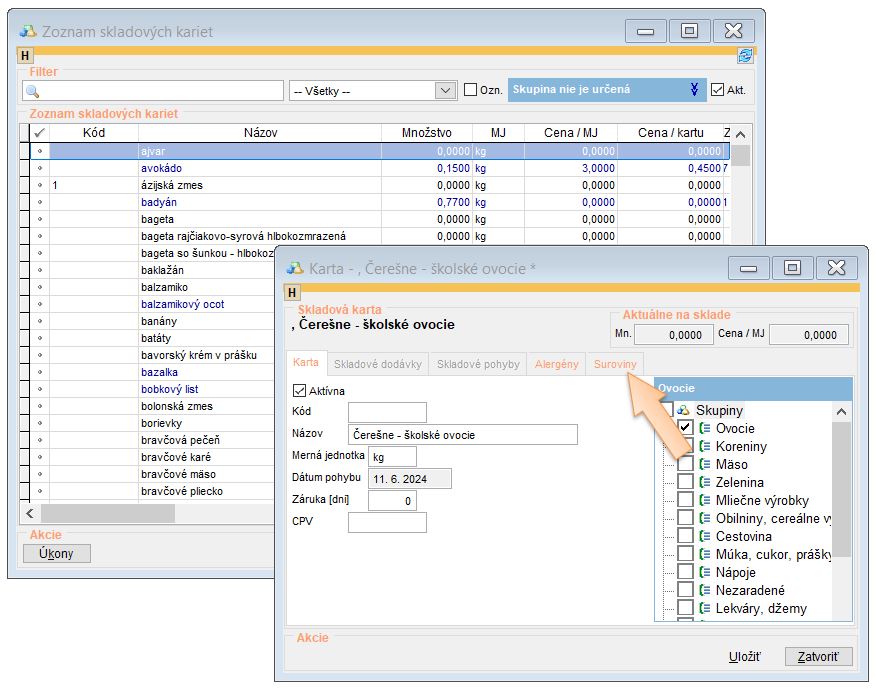 3. Prejdite do záložky Suroviny.