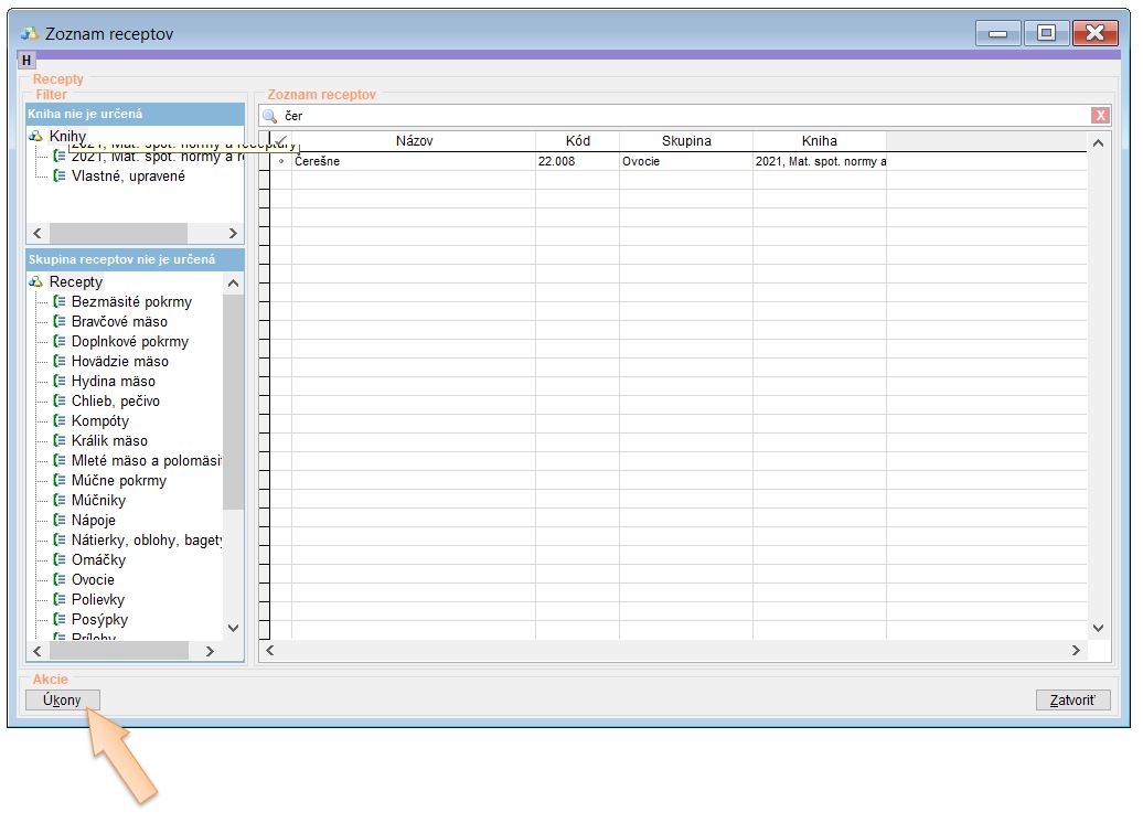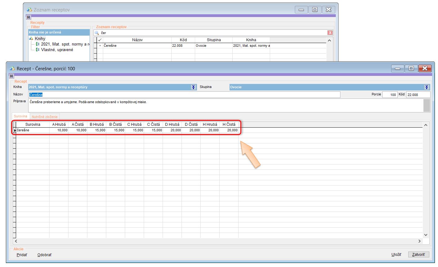 2. Pre dodržanie normovaných hmotností vyhľadajte receptúru. (V našom prípade receptúru Čerešne.)