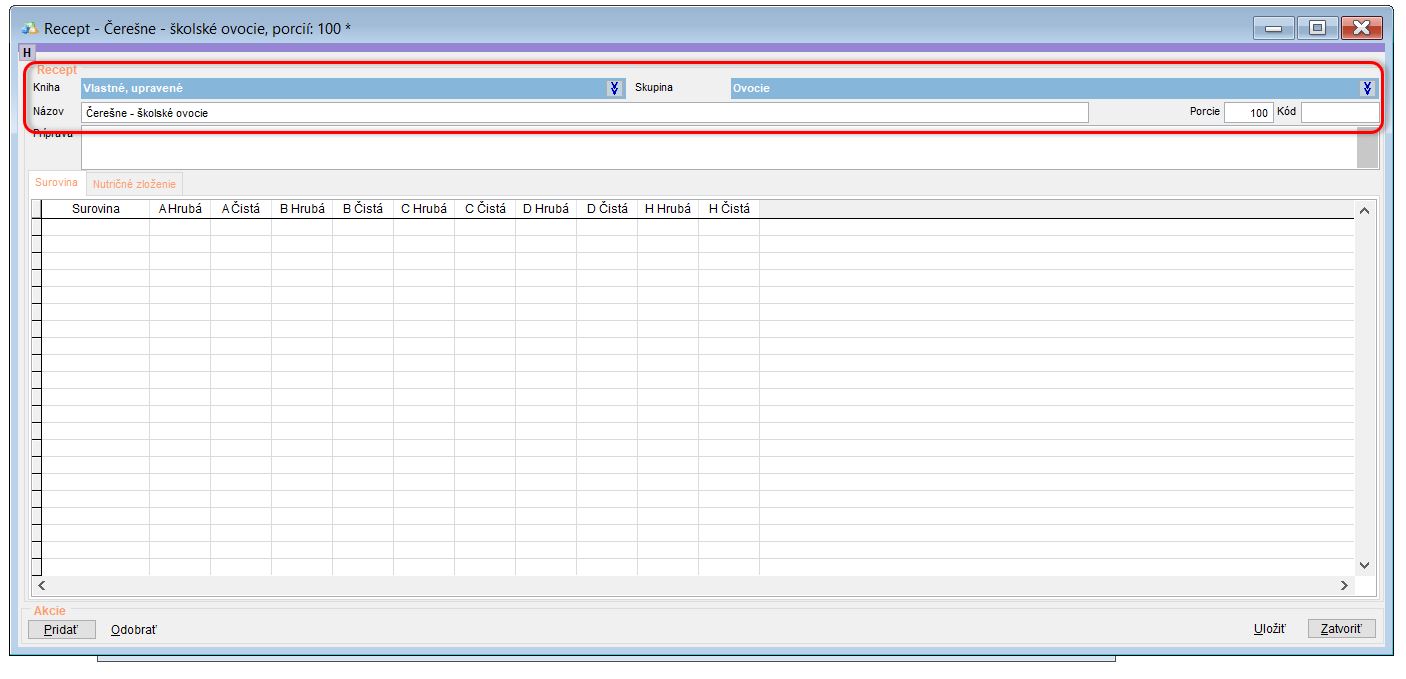 • Pre prípadnú presnejšiu evidenciu aj výživových hodnôt si môžete vyplniť aj záložku nutričné zloženie podľa pôvodnej receptúry.