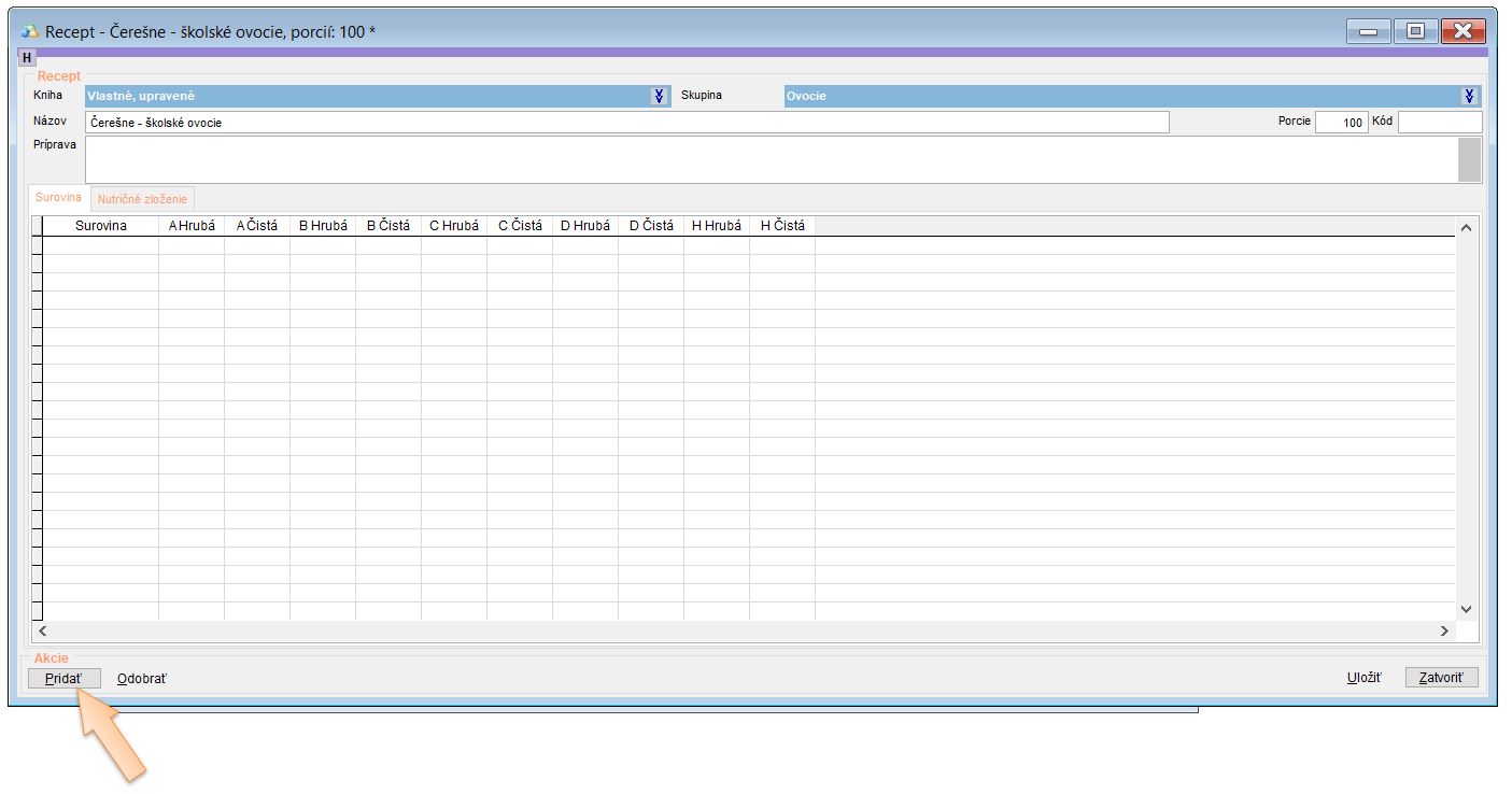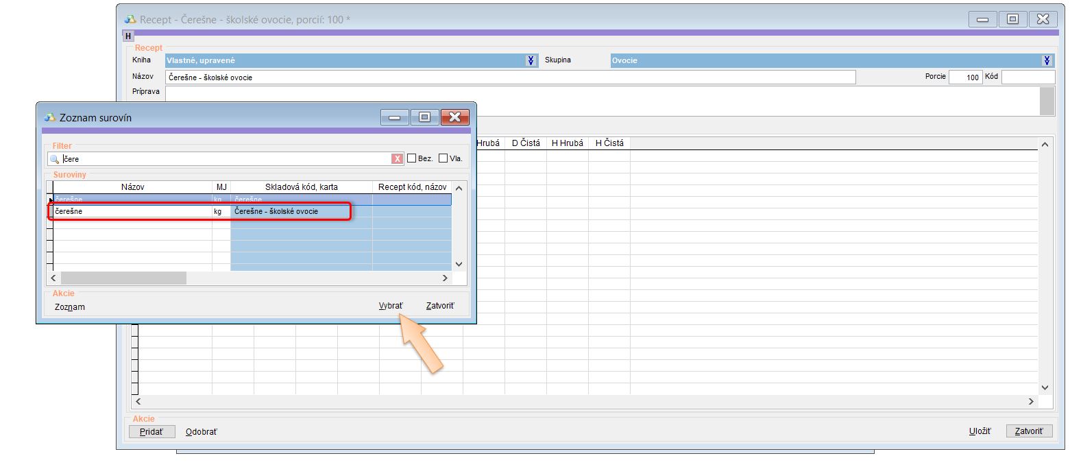 4. Kliknite na Pridať a vyhľadajte surovinu. (V našom prípade Čerešne - školské ovocie.)