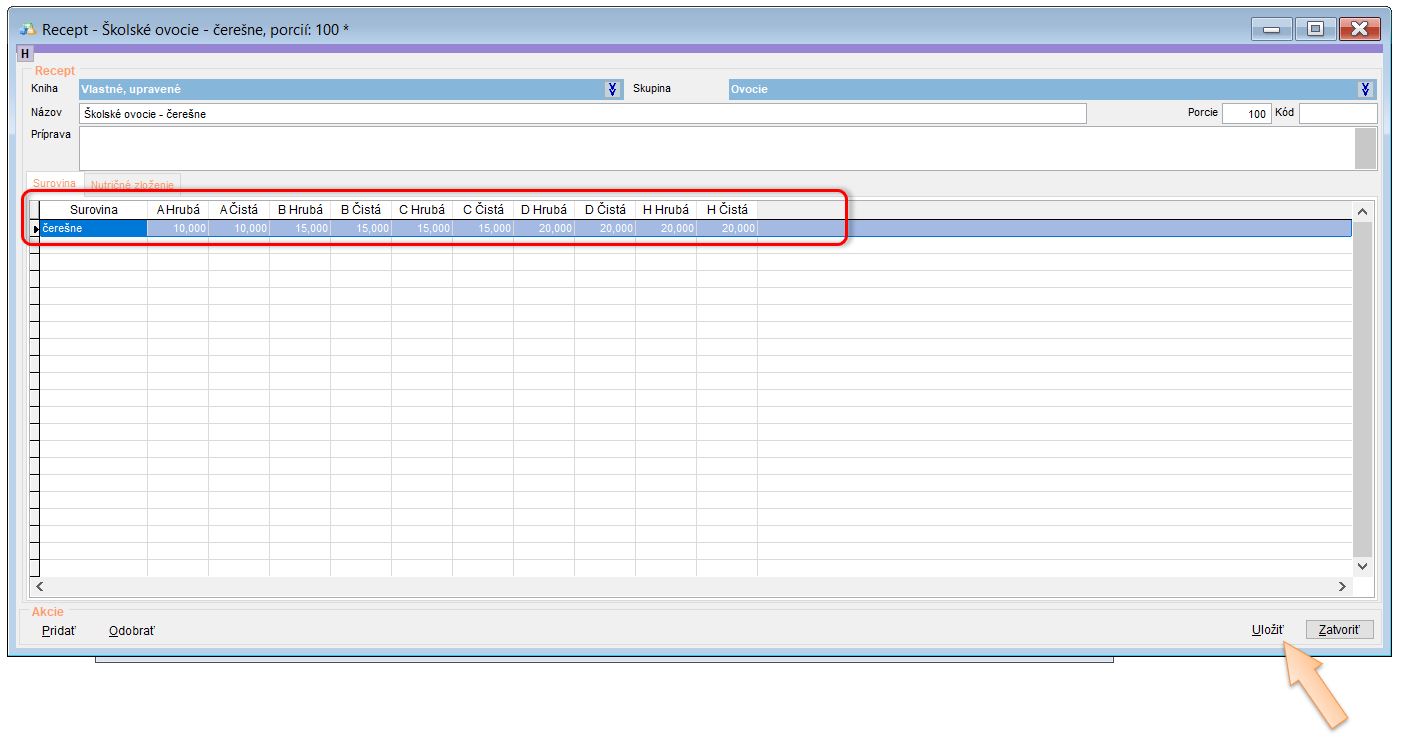 5. Zadajte názov suroviny. (V našom prípade "čerešne".)