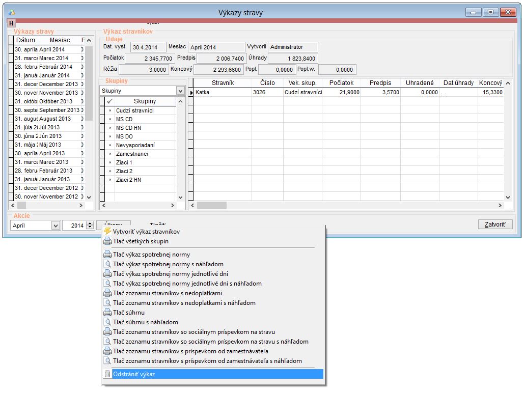 1. Odstránenie Výkazu stravovaných osôb - tento krok je potrebné vykonať vtedy, ak zistíte spätne nutnosť zmeny napr. o mesiac, dva. Po vykonaní ďalších úprav sa následne výkaz opätovne vytvorí