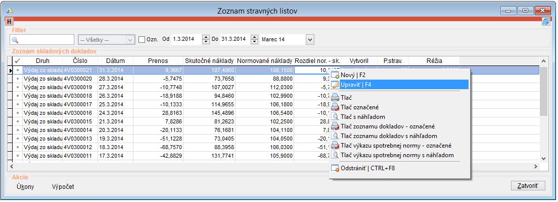 5. Posledným krokom pre správne prepočítanie prenosov z jednotlivých stravných listov, je potrebné dané stravné listy označiť, do zoznamu kliknúť pravým tlačidlom myši a z ponuky vybrať možnosť Prepočet prenosov označených stravných výdajok.