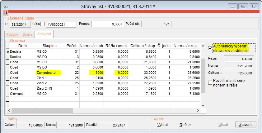 5. Pregenerovať Stravné listy aby sa aktualizovali správne ceny za stravné jednotky. Je potrebné stravný list otvoriť na úpravu a opätovne vybrať možnosť pre Automatický výber stravníkov z evidencie. Následne je potrebné vykonať prepočet prenosov stravných výdajok, aby došlo k správnemu prepočítaniu prenosov.