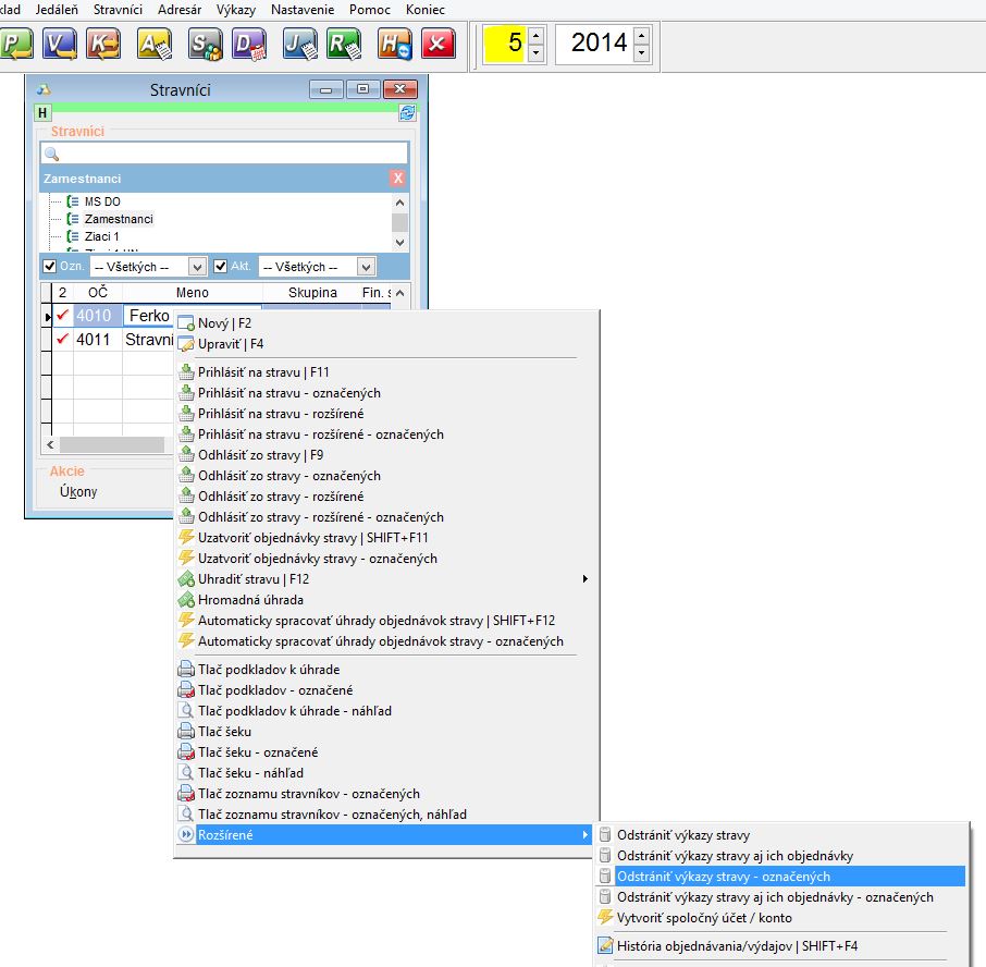 6. Následne vyberte možnosť Odstrániť výkaz stravy - označených. Pozor, neodstranujte výkaz stravy s objednávkami, pretože stratíte históriu objednávania a výdajov na označených stravníkoch!