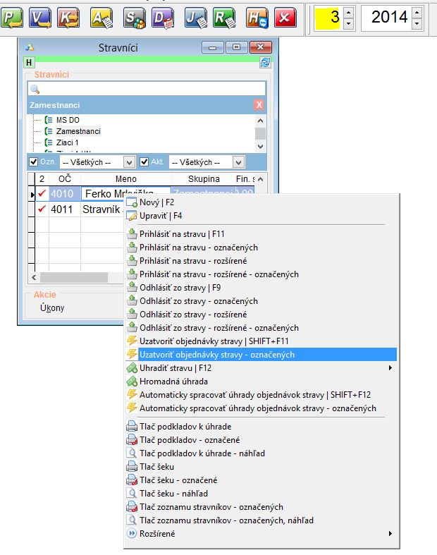 2. Opäť si označte všetkých stravníkov patriacich do danej skupiny a v zozname stravníkov kliknite pravým tlačidlom myši v stĺpci meno, zobrazí sa rozšírená ponuka, vyberte možnosť Uzatvoriť objednávky stravy - označených.
