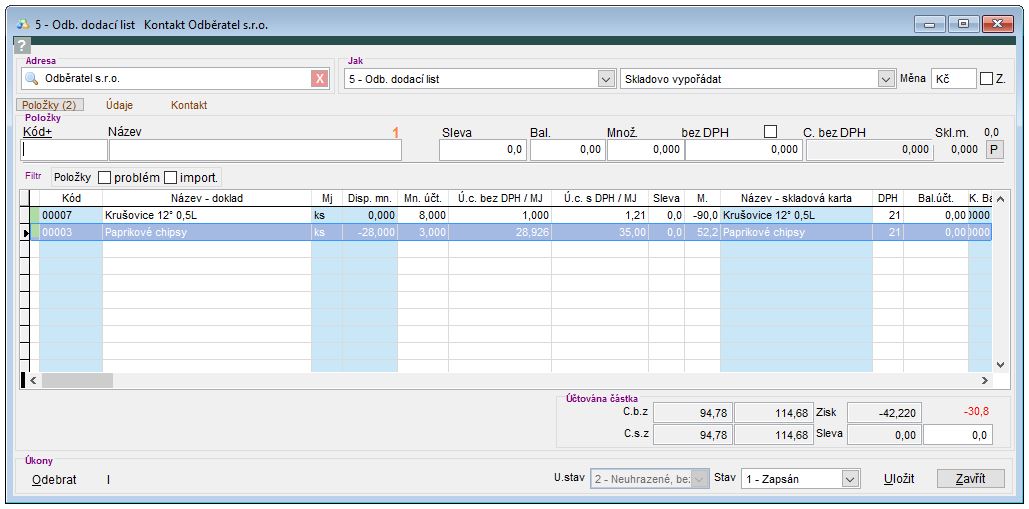 V pravé spodní části je možné vidět ceny dodacího listu a je též možné zadat celkovou slevu. Pozor! Pokud jste již některé položce zadali slevu, tak se celková sleva aplikuje i na již zlevněnou položku.