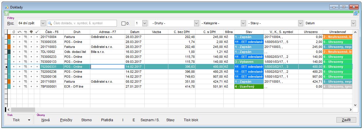 - Stavy - pomocí tlačítka je možné hromadně měnit stavy vybavenosti na dokladech. Další informace o změnách stavů se dozvíte v návodu Doklady - stav vybavenosti a uhrazení.