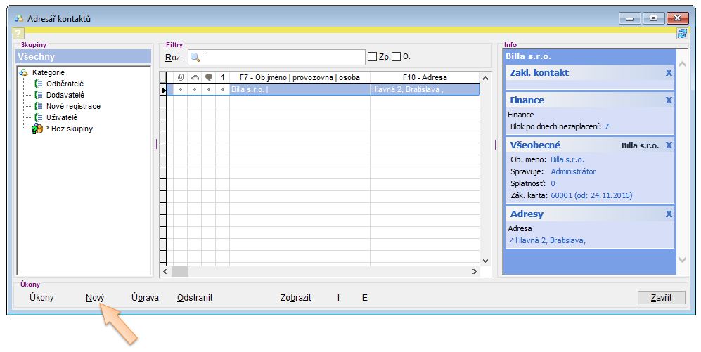 3. Nový kontakt vytvoříte kliknutím na tlačítko Nový.