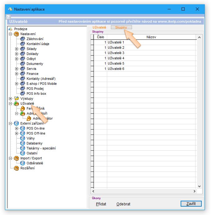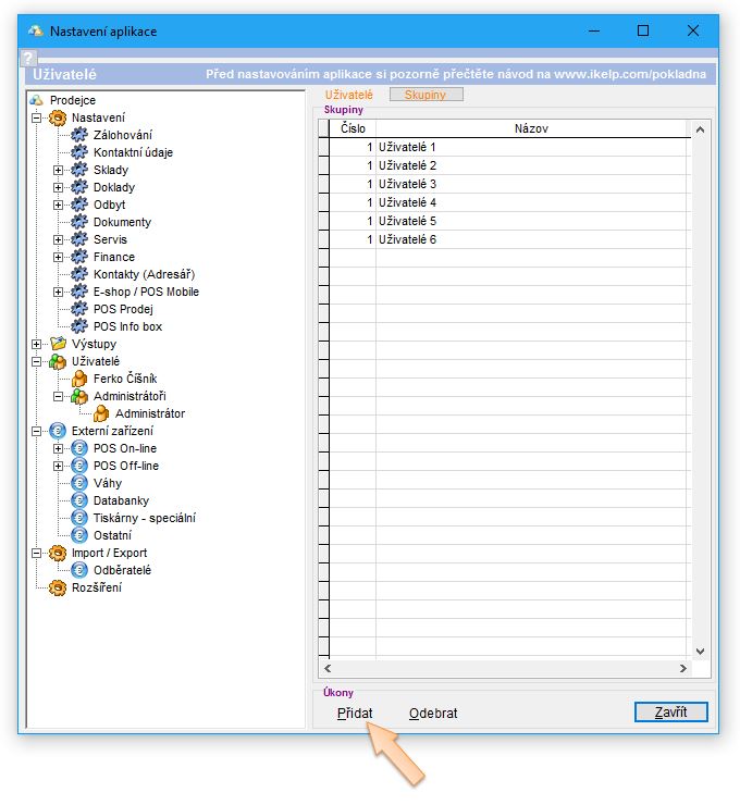 4. V záložce Skupiny klikněte na tlačítko Přidat, nebo použijte předvytvořenou skupinu. (Předvytvořenou skupinu je možné i přejmenovat, aby bylo možné ji lépe identifikovat. Např. v restauraci mohou být skupiny pojmenovány "Číšníci" a "Manažeři".)