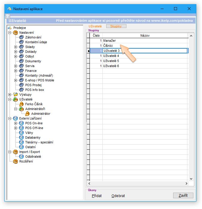 Skupinu uživatelů je vhodné vytvořit, jestliže budete mít více uživatelů, kterým je potřebné nastavit stejná práva v aplikaci. (Jsou to např. číšníci, pokladníci apod.) Následně se práva nenastavují pro konkrétního uživatele, ale pro skupinu uživatelů. Automaticky se tak aplikují všem z dané skupiny. Rovněž je tak zjednodušené vytváření nových uživatelů, kdy se nastaví jeho přihlašovací údaje a zařazením do skupiny se mu aplikují všechna potřebná práva.