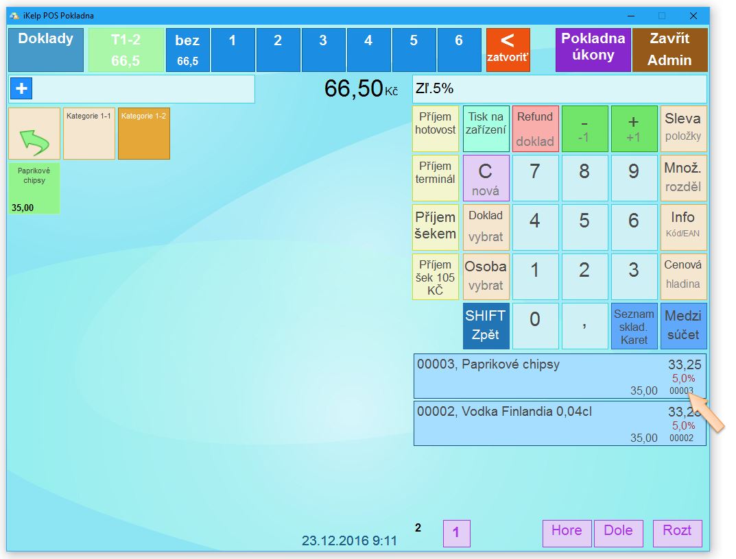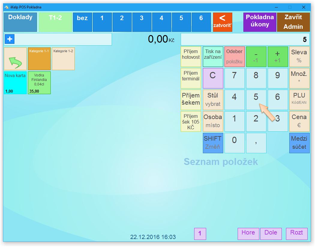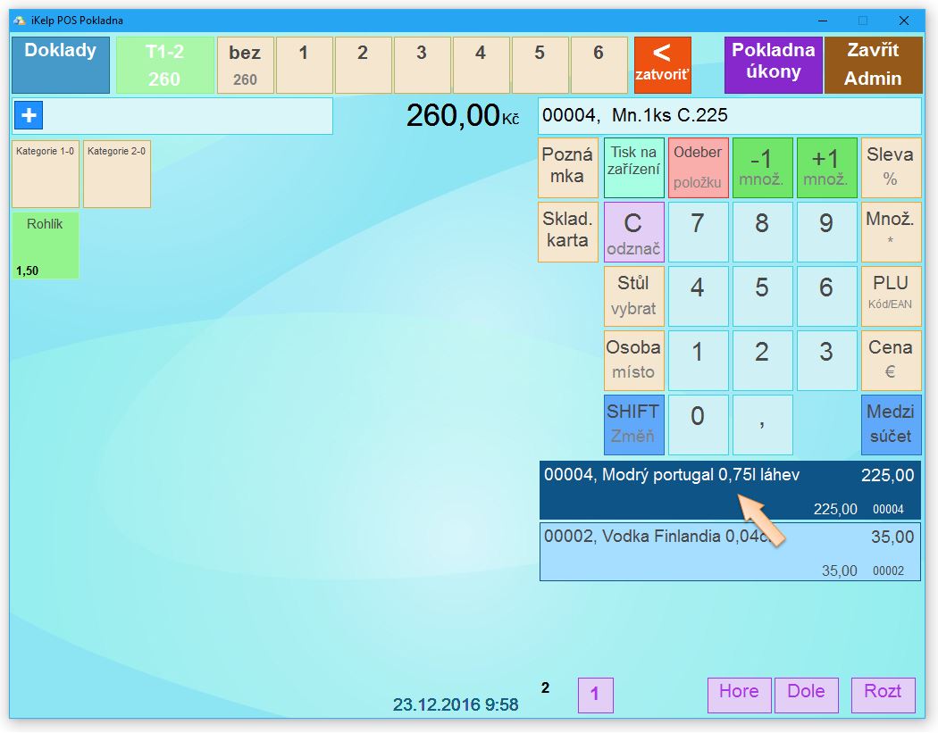3. Přidejte položku do dokladu. Položku je možné do dokladu přidat zadáním PLU, EAN kódem případně výběrem z kategorie, do které položka patří.