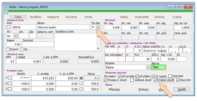 2. Nastavit příznak na kartě - "Sl. kupon" a "Vratné zboží".