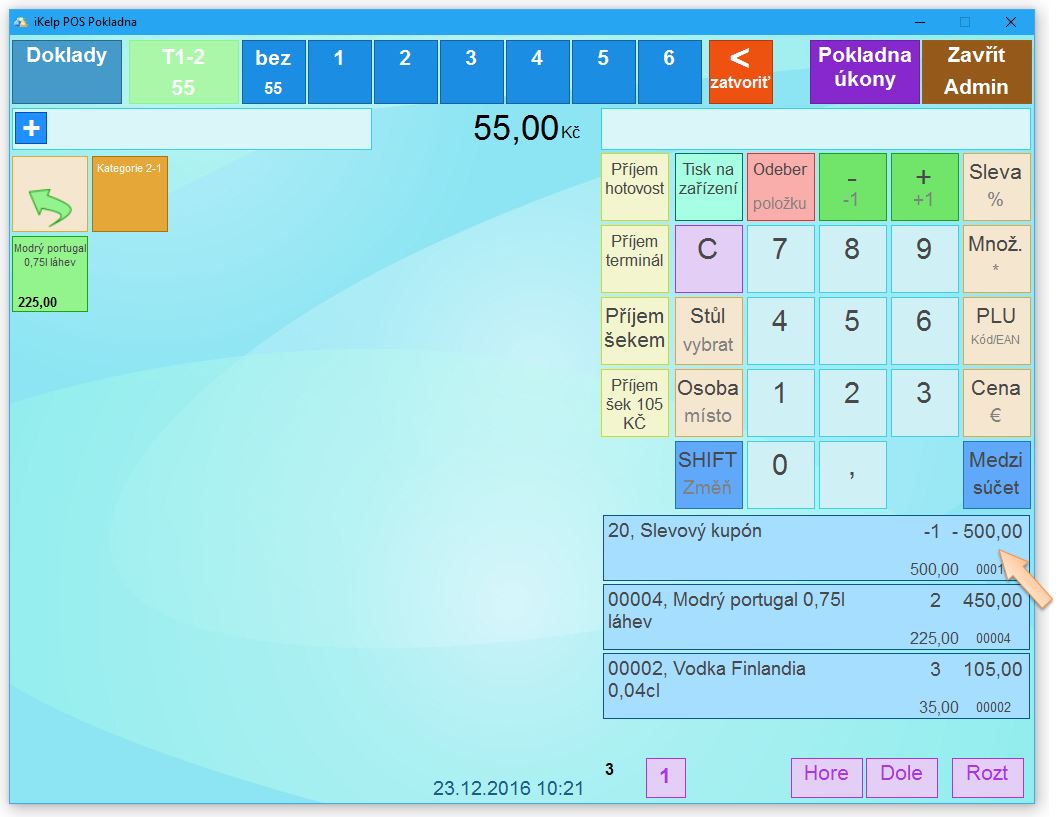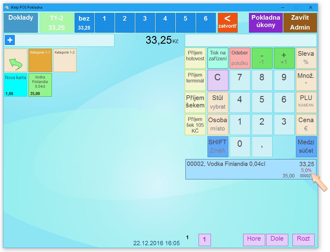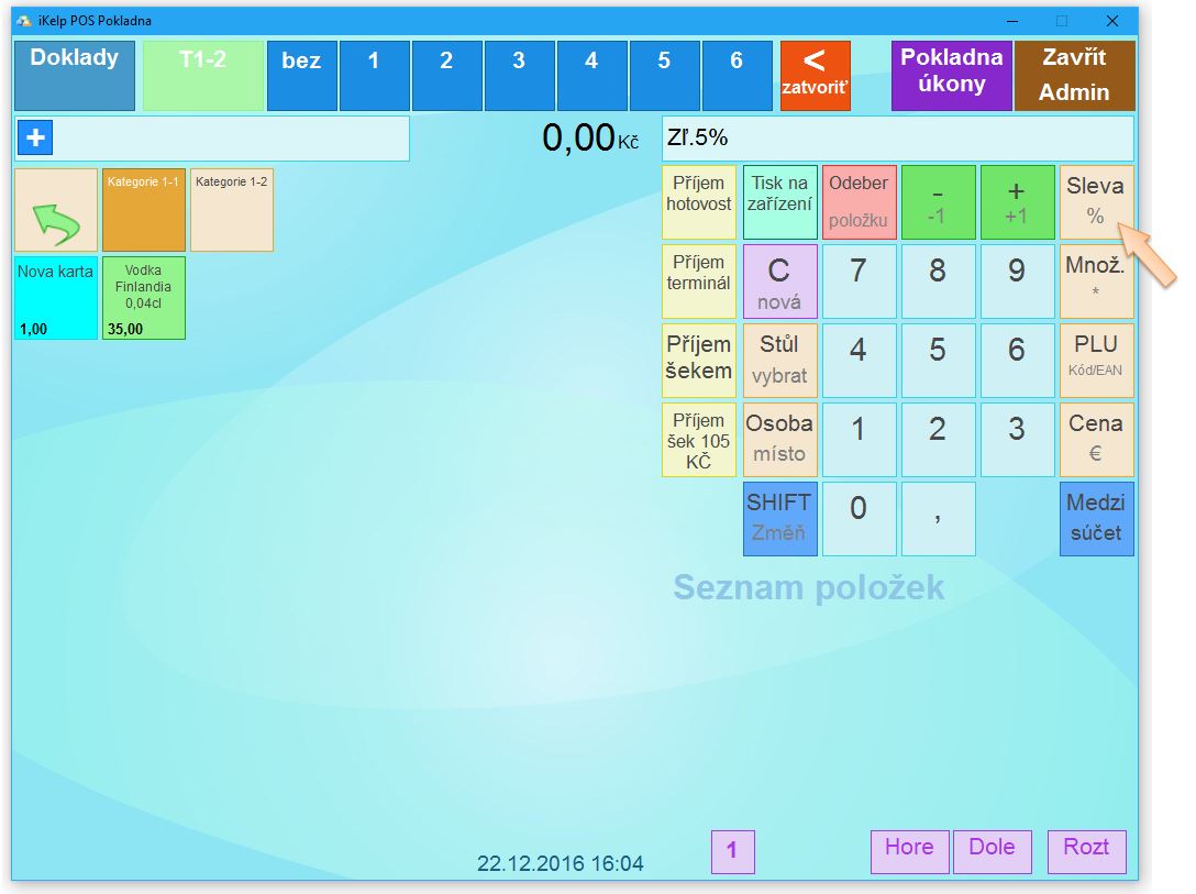 Proto, aby bylo možné v dotykové pokladně hodnotovou slevu zadat, je potřebné vykonat: