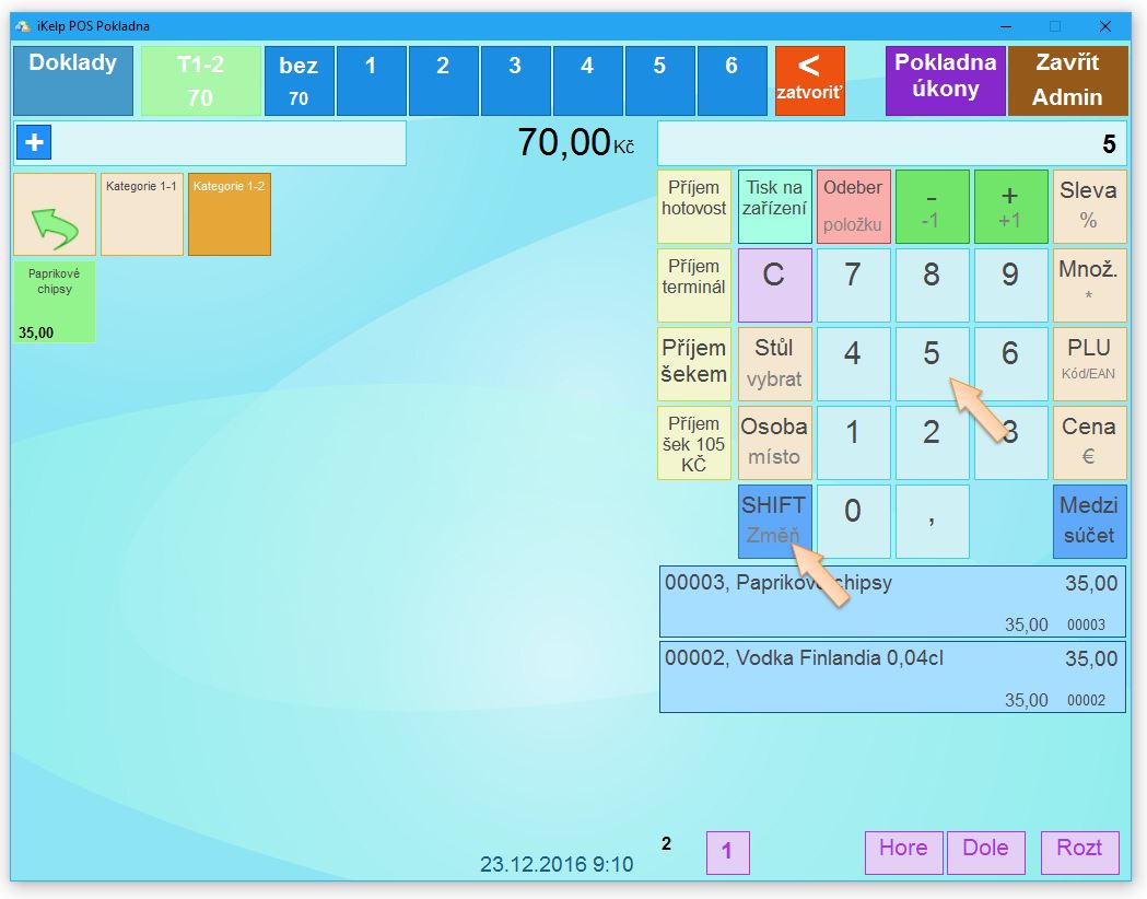 1. Klikněte na tlačítko SHIFT Změň, čímž se zobrazí rozšířená nabídka pro práci na pokladně.