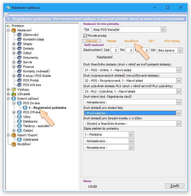 - V levé části okna, ve stromu jednotlivých nastavení vyberte možnost Externí zařízení -> POS Online -> Registrační pokladna.