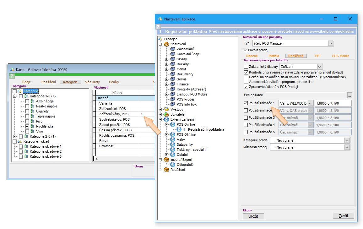 - ON-LINE, emulace EAN – váha se připojuje přímo k PC a emuluje načtení váženého čárového kódu. Obsluha položí zboží na váhu, přímo na váze vybírá/zadává číslo PLU, přes sériovou komunikaci se pošle váhový EAN, jakoby byl načtený skenerem. Vhodné, když jsou váhy daleko od pokladny, nebo když obsluhují 2 osoby – jedna váží, druhá účtuje. Toto řešení funguje v dotykovém i v nedotykovém prodeji. (U tohoto způsobu připojení váhy k aplikaci, je potřebné v nastaveních On-Line prodeje nadefinovat připojenou váhu jako skener, s nastavením čísla portu, kde je váha připojena. Zároveň je potřebné v nastaveních, v části Sklady -> Karty, aktivovat nastavení "Tvořit EAN s PLU formátem" a nastavit prefix, který je posílán z váhy, aby mohla aplikace okamžitě identifikovat, že se jedná o vážené zboží.)