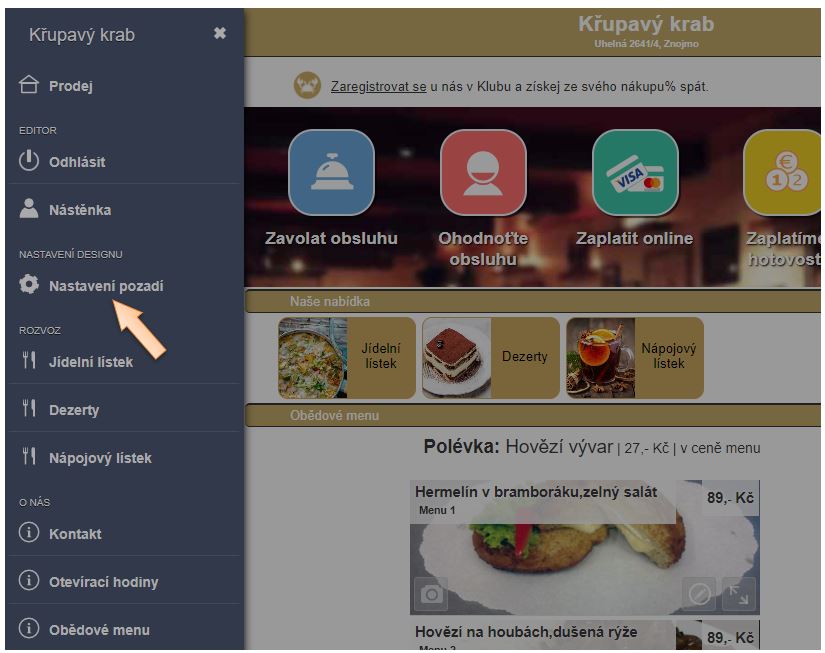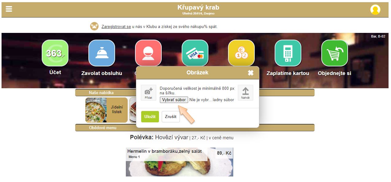 - Doporučujeme zvolit tmavší obrázek, případně jej ztmavit před tím, než je nahrán do aplikace, aby ovládací prvky a tlačítka pro zákazníka zůstaly dobře viditelné.