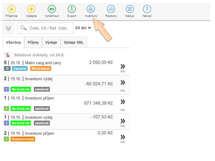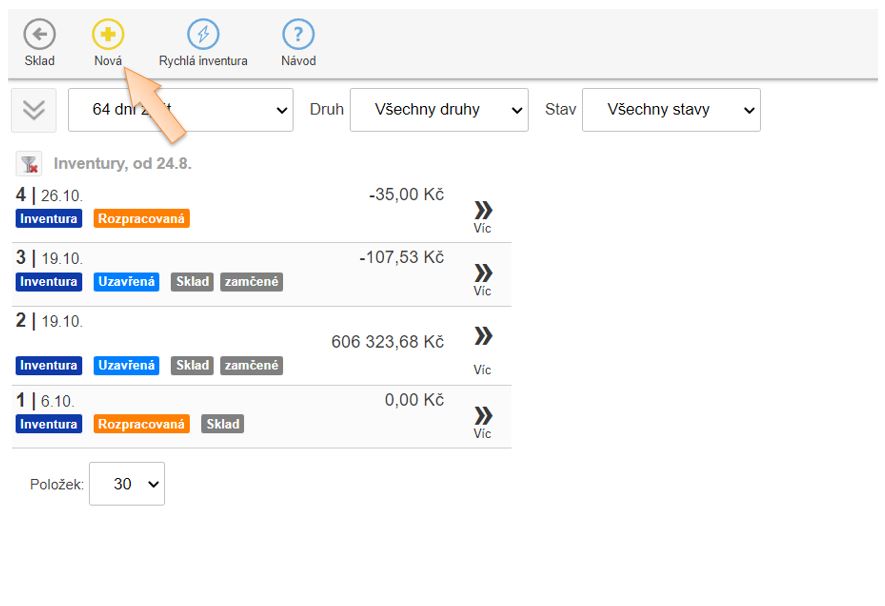 - Klikněte v menu aplikace na Sklad a vyberte Inventury.