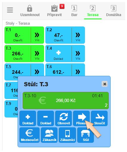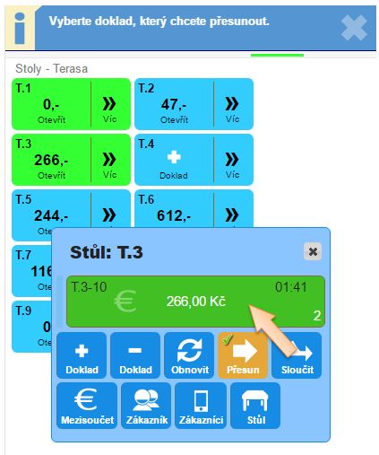 Přesun účtu na jiný stůl se využívá, chtějí-li si hosté přesednout. Důvodem může být setkání známých nebo kamarádů, stejně tak může potřeba přesunutí dokladu vzniknout při náhlé změně počasí na letní terase, kdy je třeba co nejrychleji hosty přesunout do vnitřních prostor restaurace. V tomto článku naleznete postup přesunutí dokladu na jiný stůl, přičemž v jednom čase může být na jednom stole i více dokladů. Není tedy problém, nastane-li situace, že u jednoho stolu sedí hosté, přičemž každý může mít svůj vlastní účet.