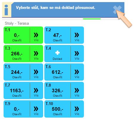 1. Hlášení o přesunu dokladu je možné zavřít, aby bylo možné vybrat místnost nebo stůl.