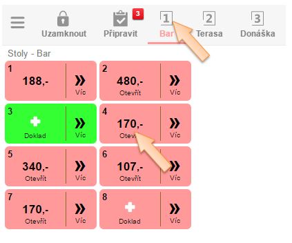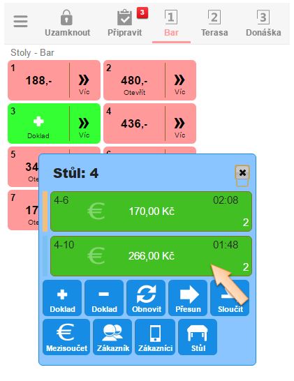 4. Klikněte na daný stůl, zobrazí se seznam účtů nacházejících se na daném stole, kde se nachází i přesunutý účet.