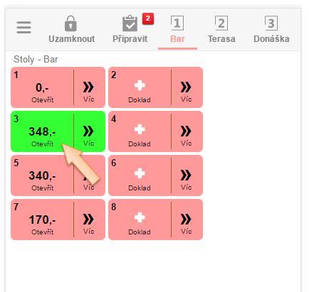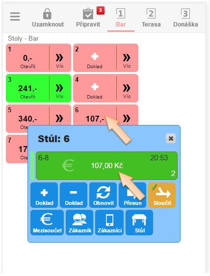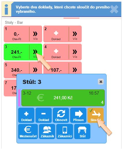 - Otevřte si detail stolu kliknutím na tlačítko Více. (Nejlépe ten, na kterém se nachází doklad, do kterého chcete sloučit druhý doklad).