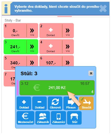 Pro sloučení dvou dokladů je potřebné otevřít si Prodej a ve vybrané místnosti vykonat: