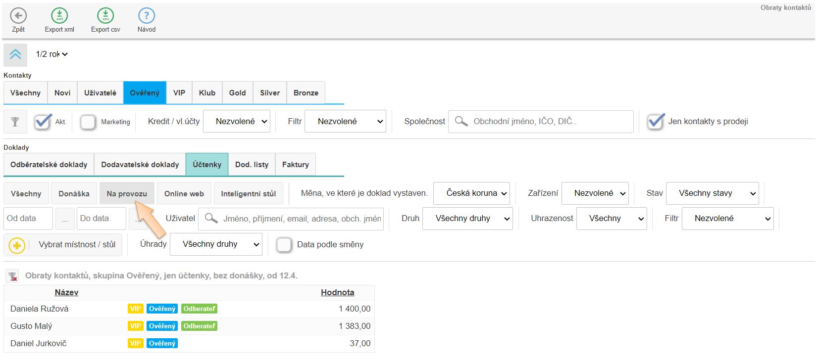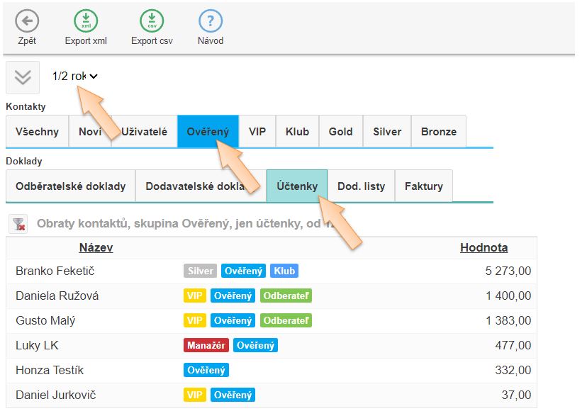 • Jen kontakty s prodeji - zobrazit jen kontakty, které měli prodeje, na které je evidován obrat.