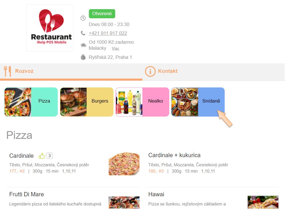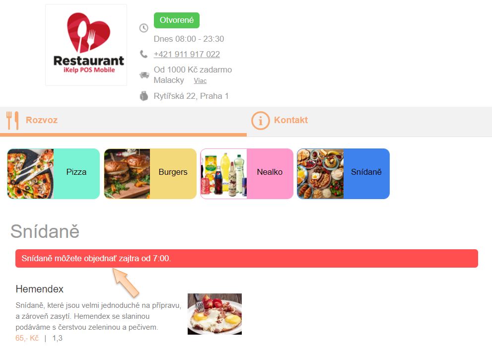 V tomto návodu Vám představíme nastavení, díky kterému je možné definovat časovou dostupnost vybraných kategorií v jídelním lístku při online objednání. Nastavení je vhodné pro konkrétní kategorie pro specifické kategorie jako např. snídaňové menu (dostupné od 6:00 - 9:30, pondělí – pátek), speciality na grilu (dostupné od 16:30 - 22:00) apod, které jsou dostupné jen v určitém čase. Samozřejmě je možné si nadefinovat čas dostupnosti podle požadavků.