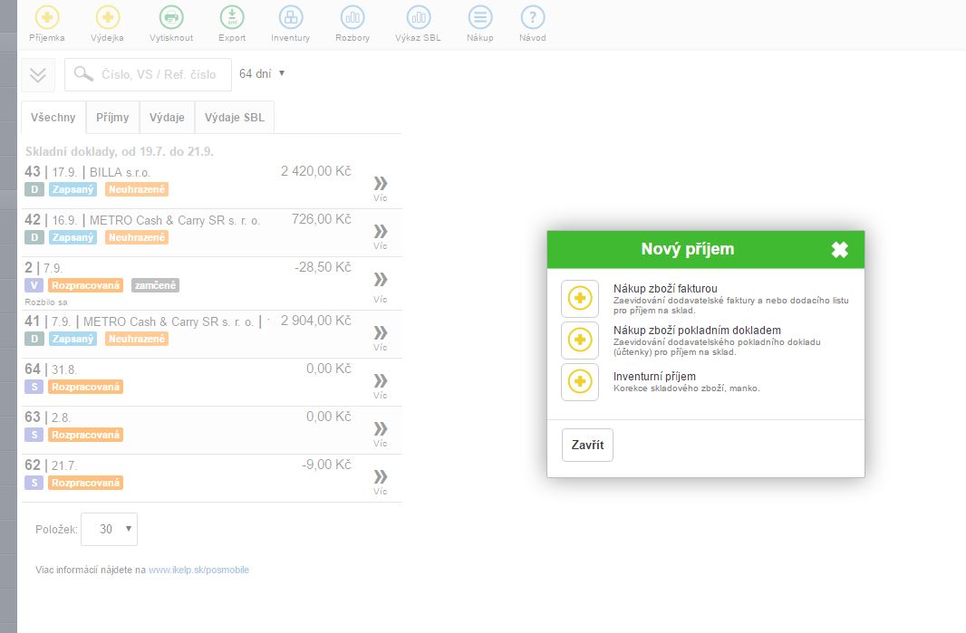 Po kliknutí na tlačítko + Příjemka ve skladové části aplikace, se zobrazí okno s možnostmi pro příjem zboží na sklad.