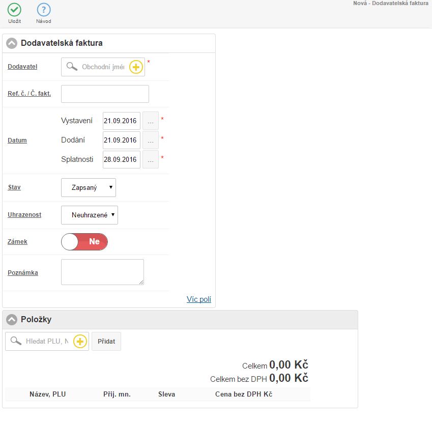 • Dodání - datum dodání zboží nebo služby. (Datum, ke kterému se připíše zboží na sklad.)