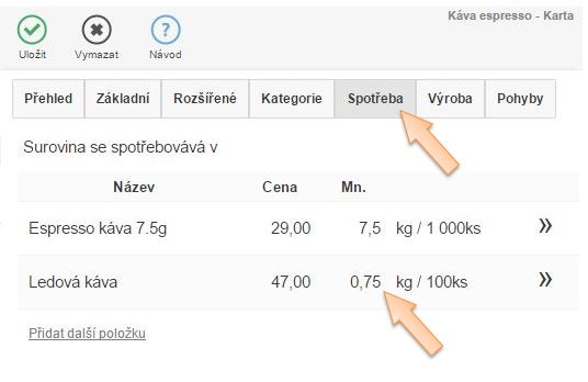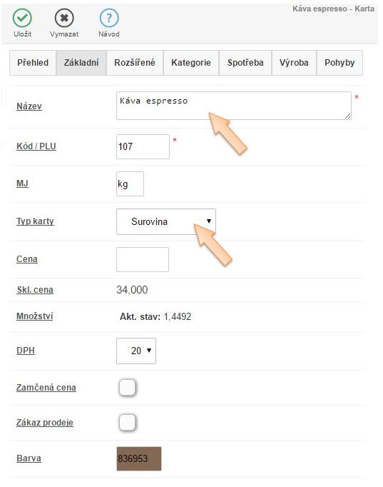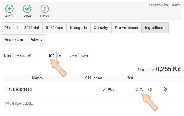 Už při zakládání skladové karty by mělo být jasné o jaký typ zboží se jedná. Kávu zřejmě nebudete prodávat tak, jak jste ji nakoupili od dodavatele tedy v 0,25 resp. 0,5 nebo 1,0kg balení. Proto je vhodné založit skladovou kartu jako Surovinu, která bude přijímaná v kilogramech. Tato bude následně vstupovat do receptur, které budou odepisovat nadefinované množství. (Rovněž jako v případě kávy doporučujeme jako karty typu Surovina zakládat karty, které vstupují do výroby jídel, nápojů, masa, zeleniny, ovoce a tekutiny které neslouží na přímý prodej.)