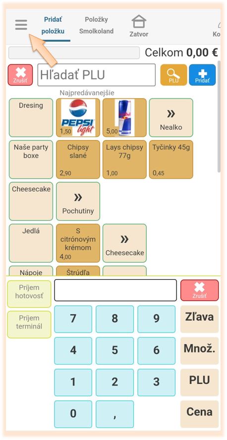 1. Kliknite na ikonu menu aplikácie iKelp Pokladňa.