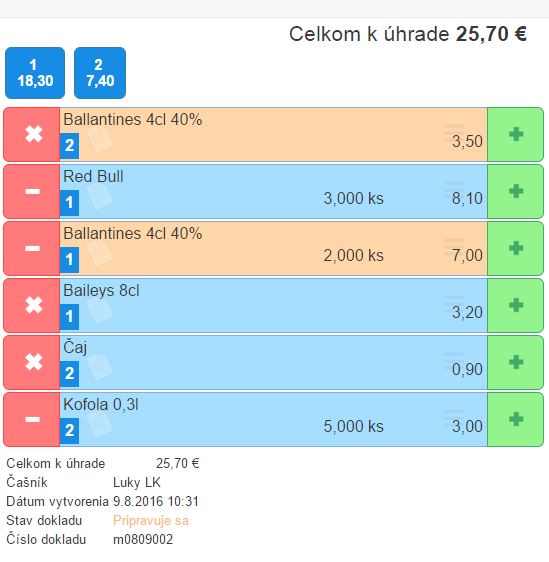 - Skôr, ako je možné presunúť z existujúceho dokladu len časť položiek, je potrebné tieto položky rozúčtovať na osoby. Položky je možné na osoby účtovať hneď pri ich objednávaní zákazníkom, prípadne ich rozdeliť na osoby dodatočne. (Postup účtovania s účtovaním na osoby sa dozviete v návode Pridávanie položiek do dokladu (do otvoreného účtu). Viac informácií o dodatočnom rozúčtovaní položiek medzi jednotlivé osoby sa dozviete v návode Rozúčtovanie na osoby v položkách otvoreného účtu.)