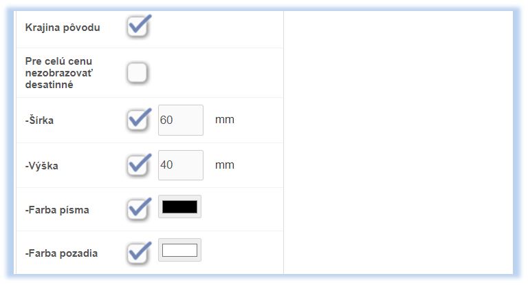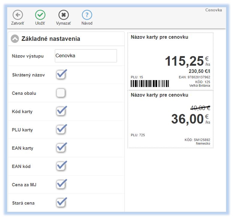 Tlačový výstup cenovky je možné si nadefinovať a nadizajnovať podľa vlastných požiadaviek. Údaje, ktoré sa na cenovke tlačia, jej veľkosť prípadne farbu, si viete nadefinovať v časti: