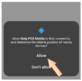 • U verze Android 12 a výše, je třeba povolit v rámci systému android komunikaci aplikaci POS Mobile s Blueetooth zařízením kliknutím na Allow.