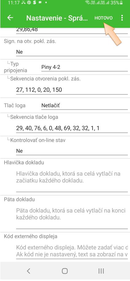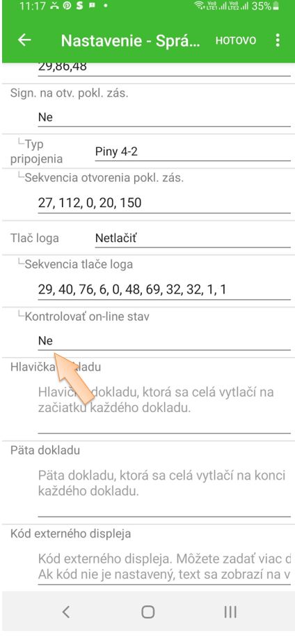 8. Vypnutí Kontrolovat on-line stav. Toto nastavení by způsobilo problémy s funkčností samotné aplikace POS Mobile. Stav zařízení se na pozadí kontroluje na úrovni OS Android a ovladače k dané tiskárně, takže aplikace i přes vypnutou kontrolu dokáže detekovat, jestli je tiskárna zapnutá, jestli jí nechybí papír a upozornit na to obsluhu.