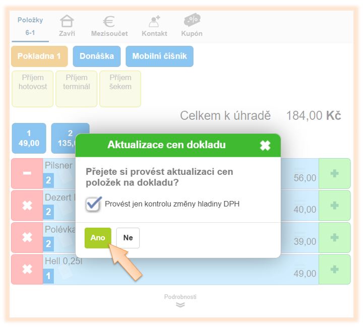• Přejete si provést aktualizaci cen položek na dokladu? - po kliknutí na Ano se provede přepočet DPH na položkách.