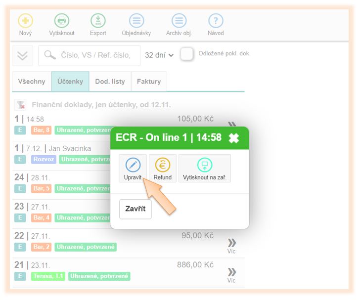 2. Vyhledejte v seznamu doklad a klikněte na Více, následně Upravit.