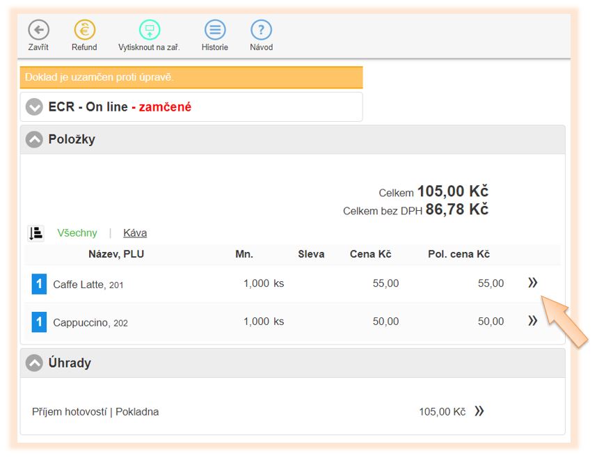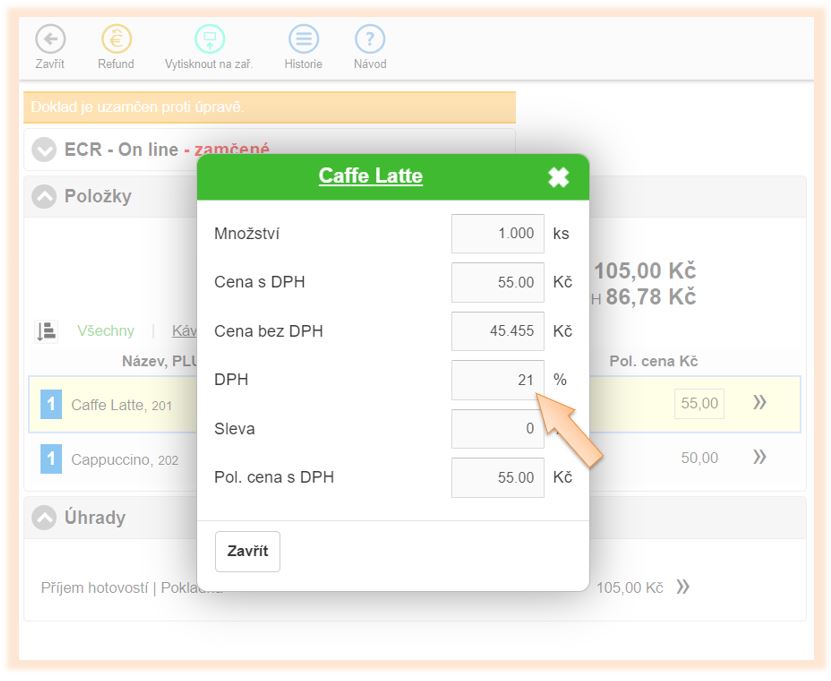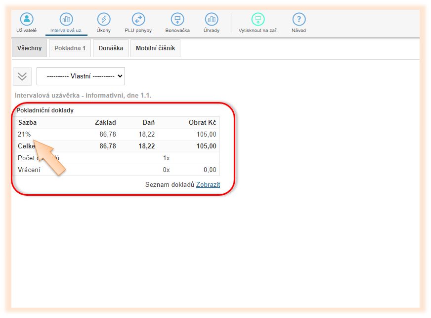 To, s jakou DPH byly jednotlivé doklady účtovány, je možné zobrazit v seznamu dokladů v detailu daného dokladu. Pokud potřebujete mít přehled o tom, v jaké sazbě DPH byly doklady účtovány za určité období, je tuto informaci možné zobrazit v části Pokladna úkony.